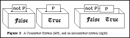 Let us first consider what is required in order to distinguish between statements in the "true" box and those in the "false" box. In our logical system, each statement has a negation. If P represents a statement, then not-P represents its negation. It is fundamental to the sorting process that if P is true, then not-P is false, and vice versa. In other words, if one can prove that P goes into the "true" box, then that same proof shows that not-P goes into the "false" box. Now suppose it were possible to prove that both P and not-P go into the same box. Then there can be only one box. Every statement goes into the same box, and there is no sorting possible! Such a system, in which a statement and its negation are both true is said to be inconsistent. In order for any sorting to be done, the system must be consistent. That is, it must not be possible to prove any statement and its negation.